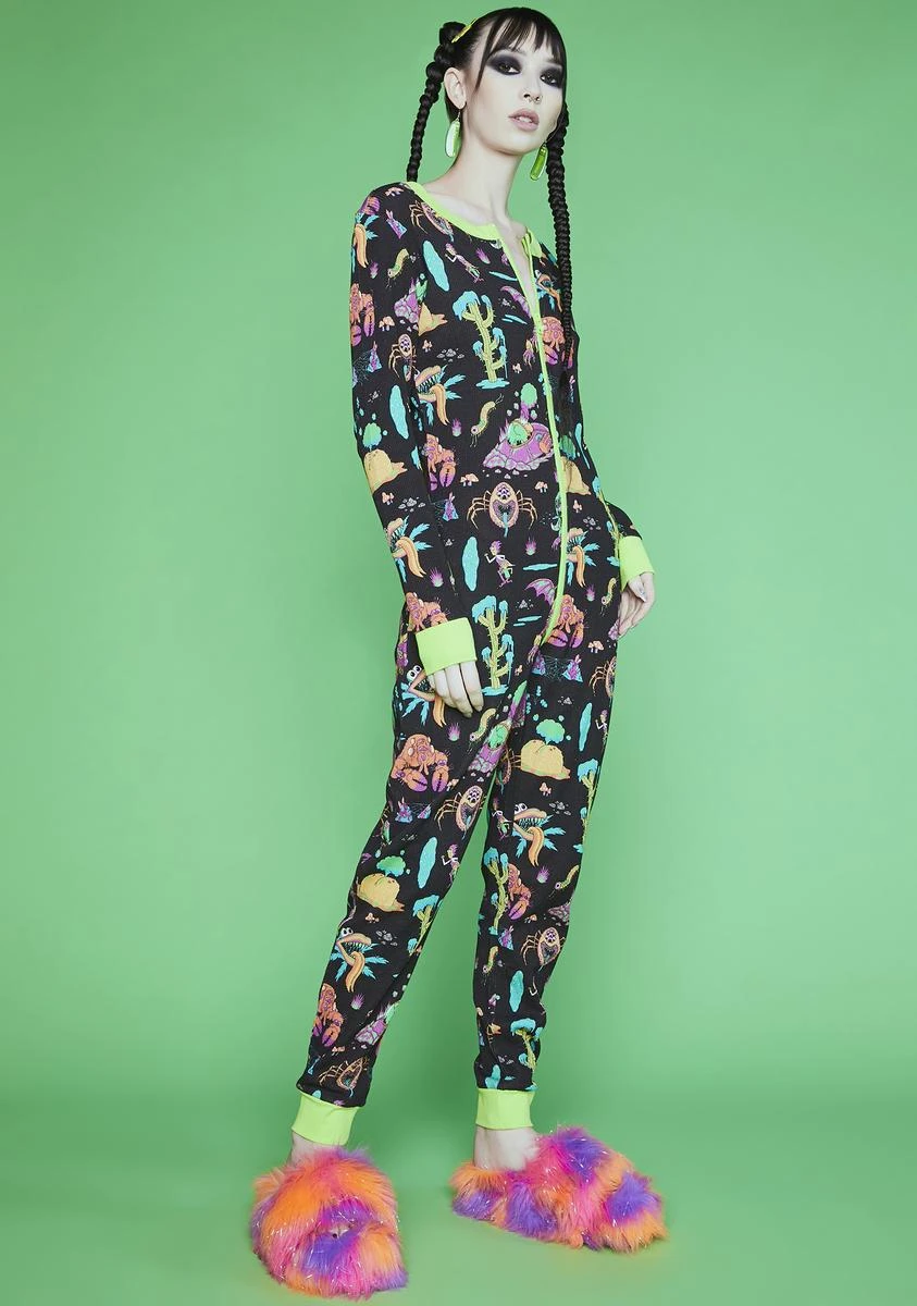 friend or foe? Let’s hope the aliens are friendly in this thermal onesie that has a waffle knit construction, an all over alien print, a contrast colored trim, and a front zipper closure.