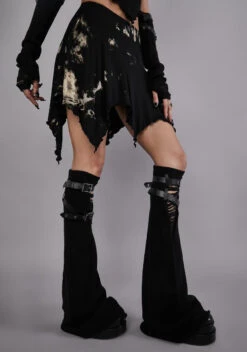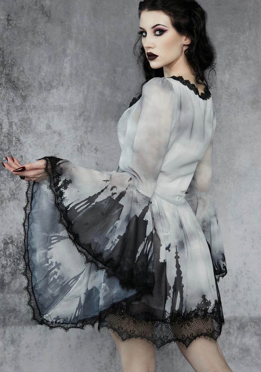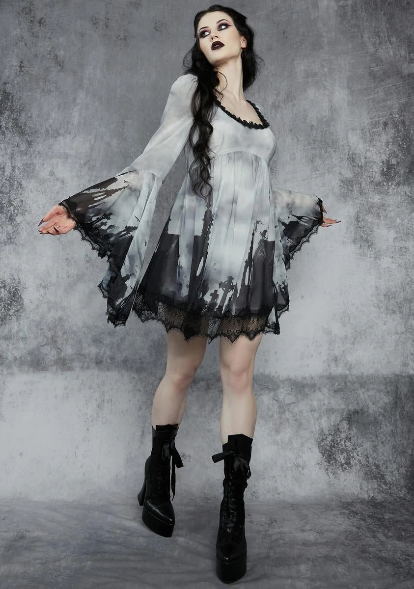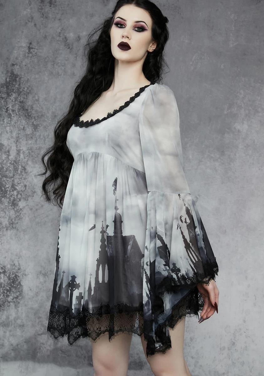 we’ll see you in the afterlife… This mini babydoll dress has a graveyard print all over, a flowy chiffon construction, exaggerated bell sleeves, lace trim, and a side zip closure.