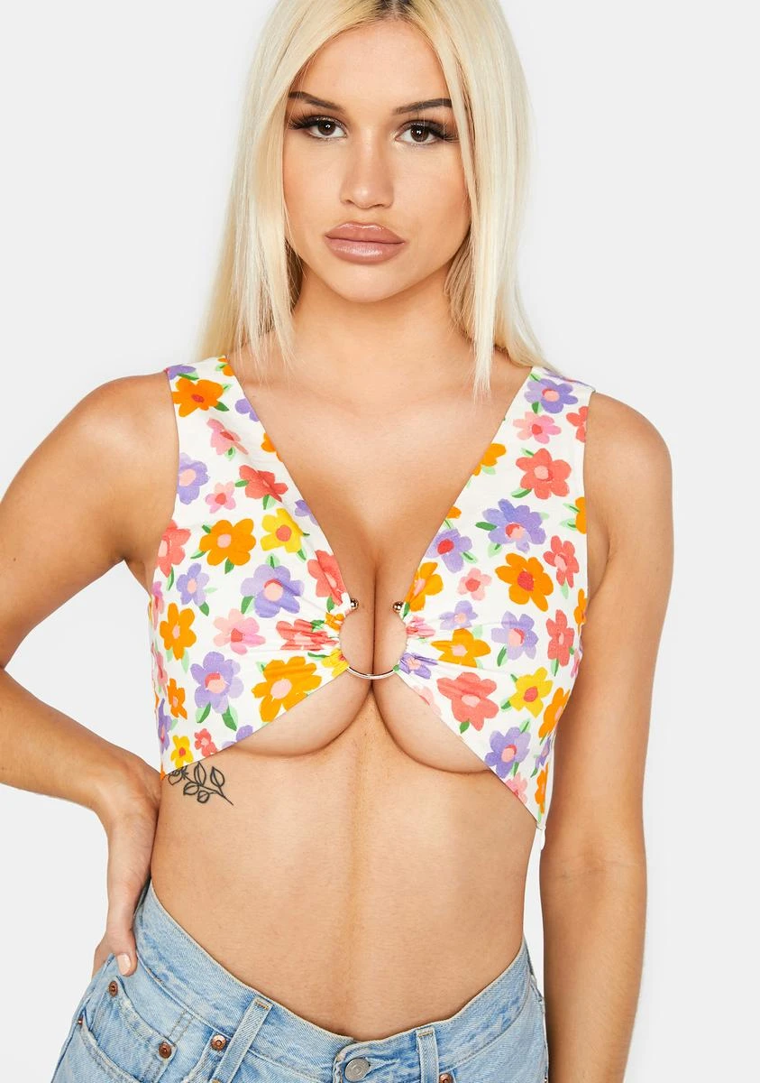 cuz this is where you flourish. This crop top comes in a linen construction, with a v-neckline, bull ring detail, zip closure, and a floral print all over.