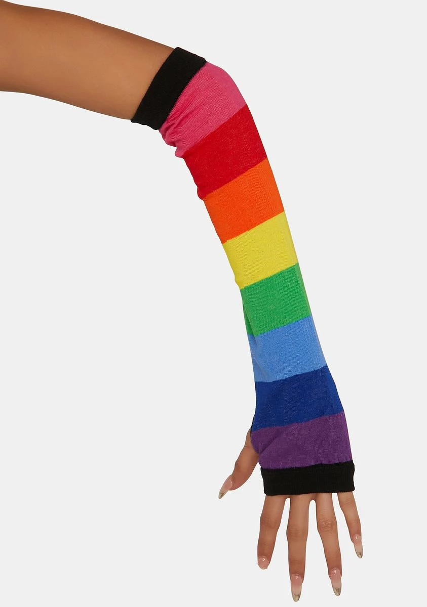 cuz we’re feelin’ grateful for you. These above-elbow gloves have a fingerless construction and a striped rainbow print all over.