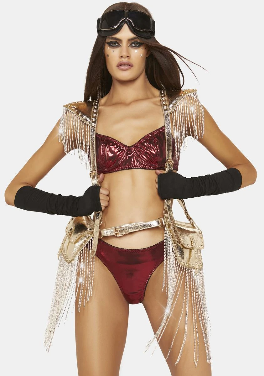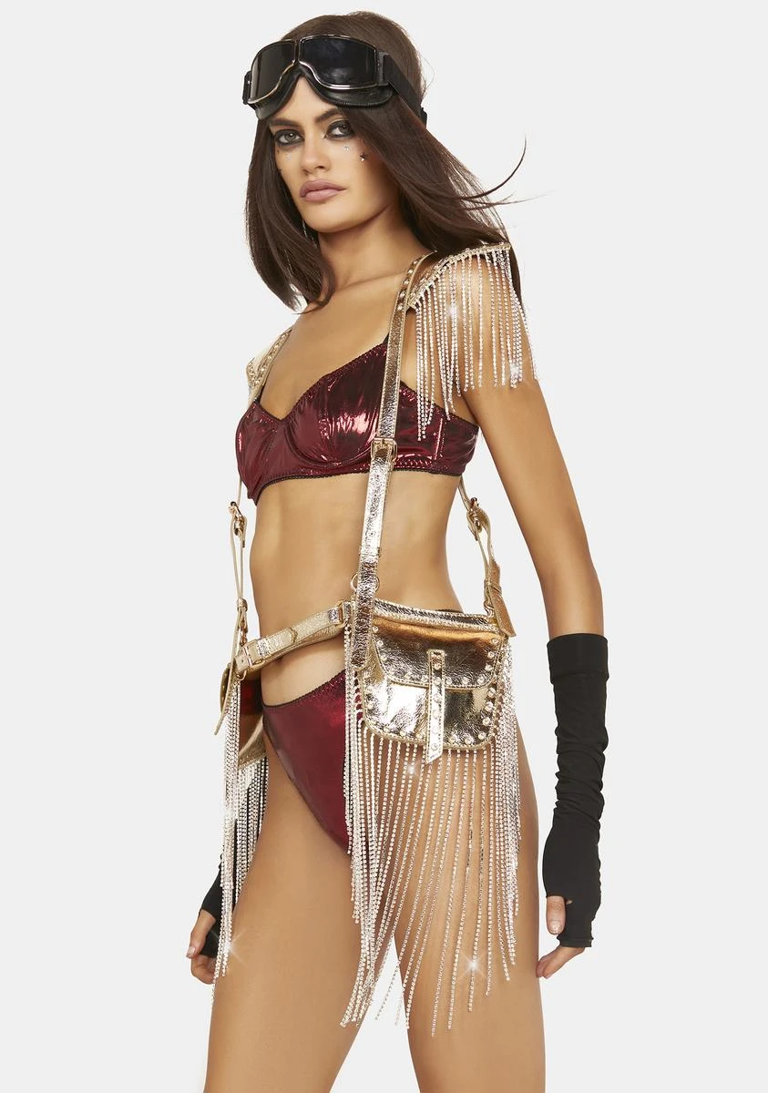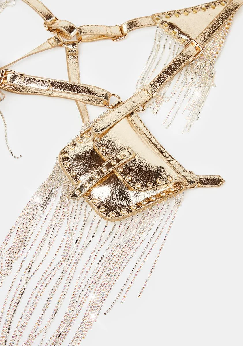 cuz you’re a hunk of burning love. You’ll feel their temperature rise when you put on this harness that has a vegan leather construction, a metallic finish, iridescent rhinestone fringe, rhinestone studded detailing, rhinestone studded pouches on the sides, and adjustable buckle closures.