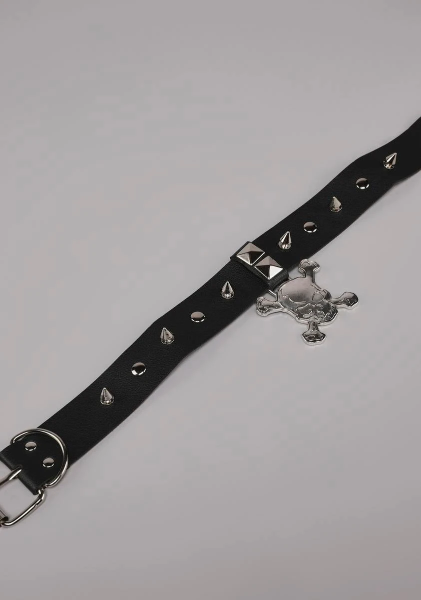 cuz it’s only a matter of time. This choker has a vegan leather construction, spiked stud detailing, a silver skull and crossbones charm in the center, and adjustable buckle closures.