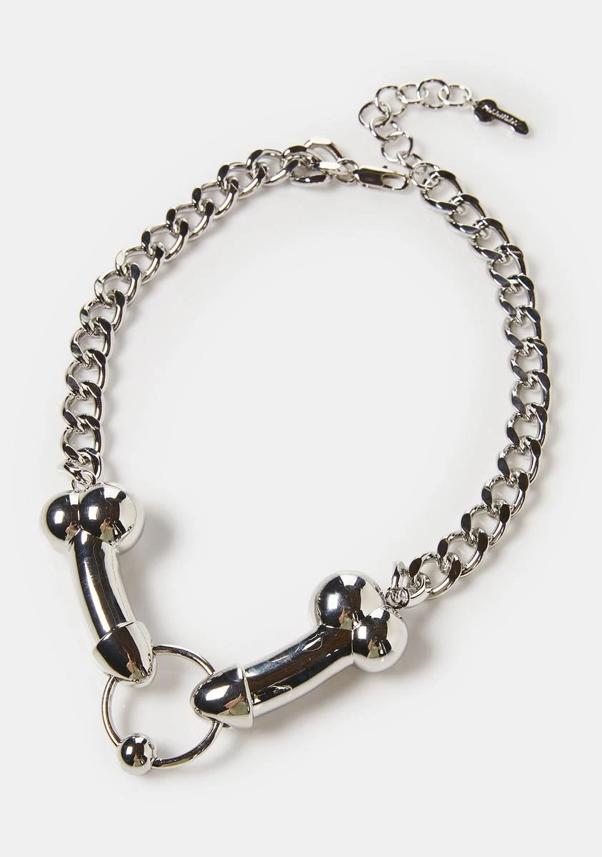 DTF? This chain choker necklace has an adjustable clasp closure, dick shaped charms, and a prince albert O-ring piercing.