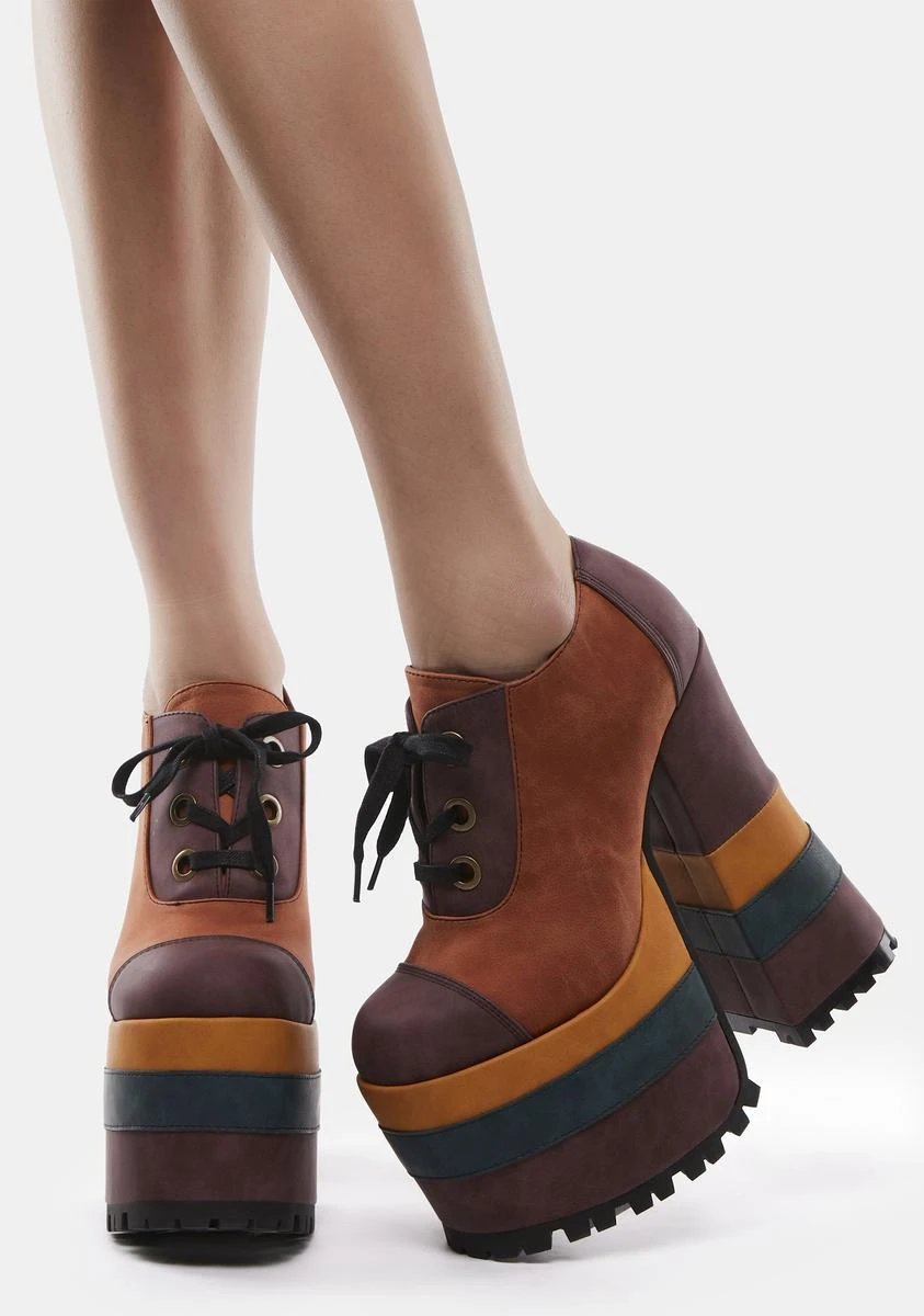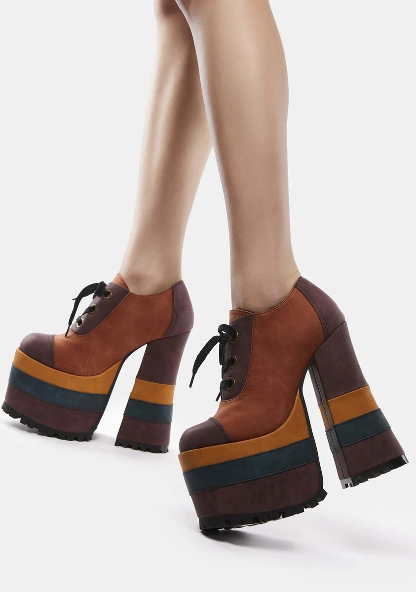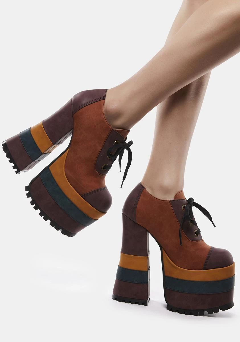 cuz it’s time to boogie down! These out of sight platform oxfords have a vegan suede construction, a multicolored striped platform sole and heel, a rounded toe design, and adjustable lace-ups.