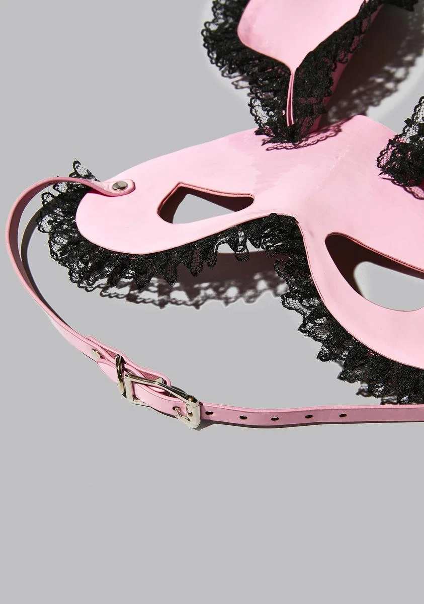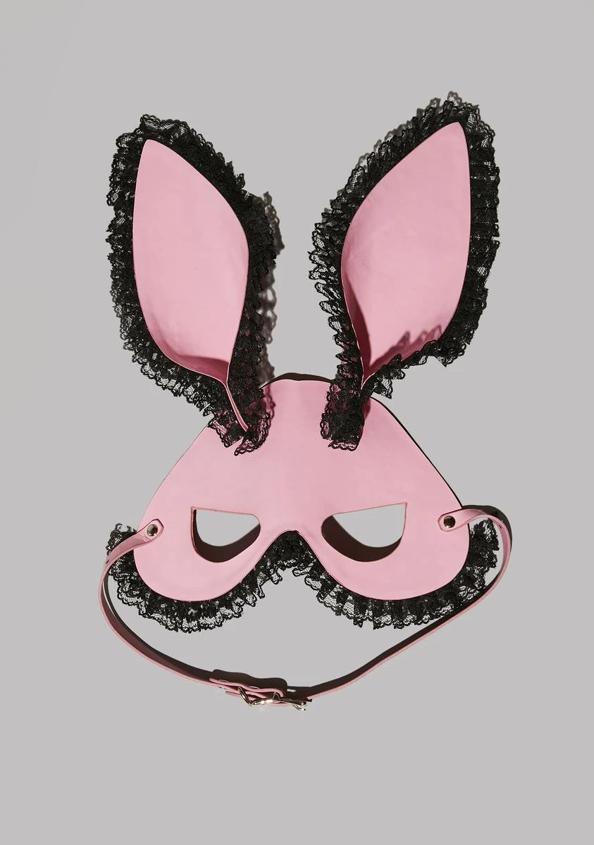 cuz you’re as cute as one. This face mask has a patent construction, bunny ears on top, and a black lace trim.