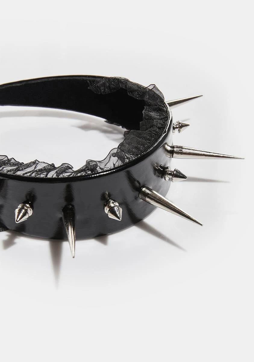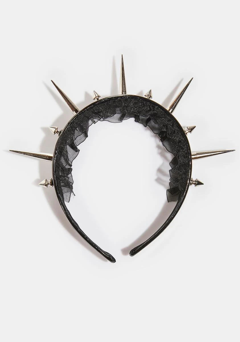 you’re a regular around these parts. This patent headband has silver spike studs in alternating sizes across the top and ruffled lace trim accents.