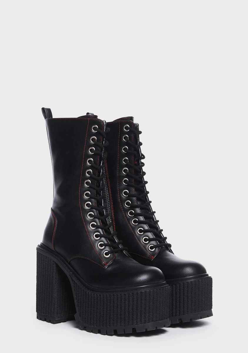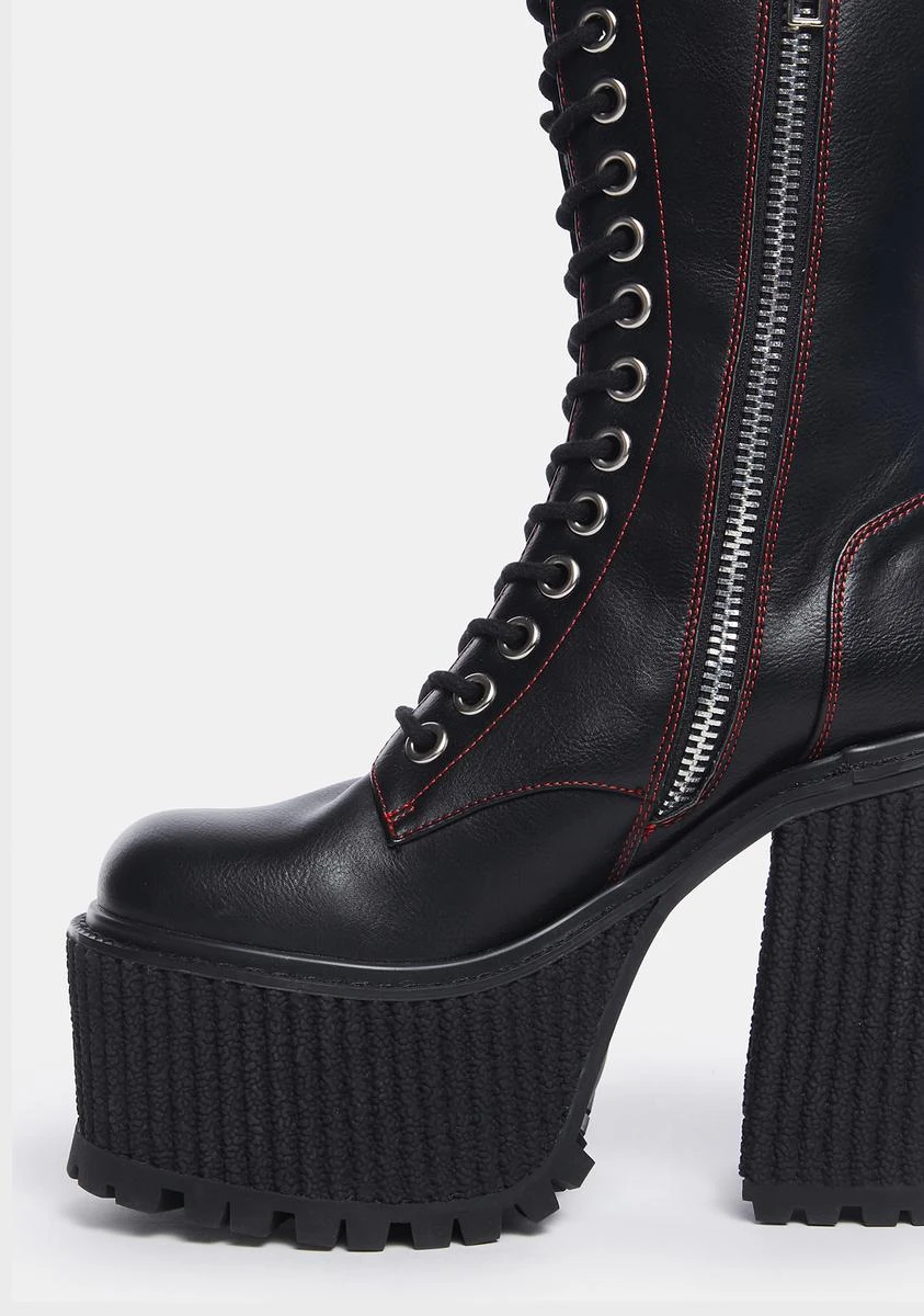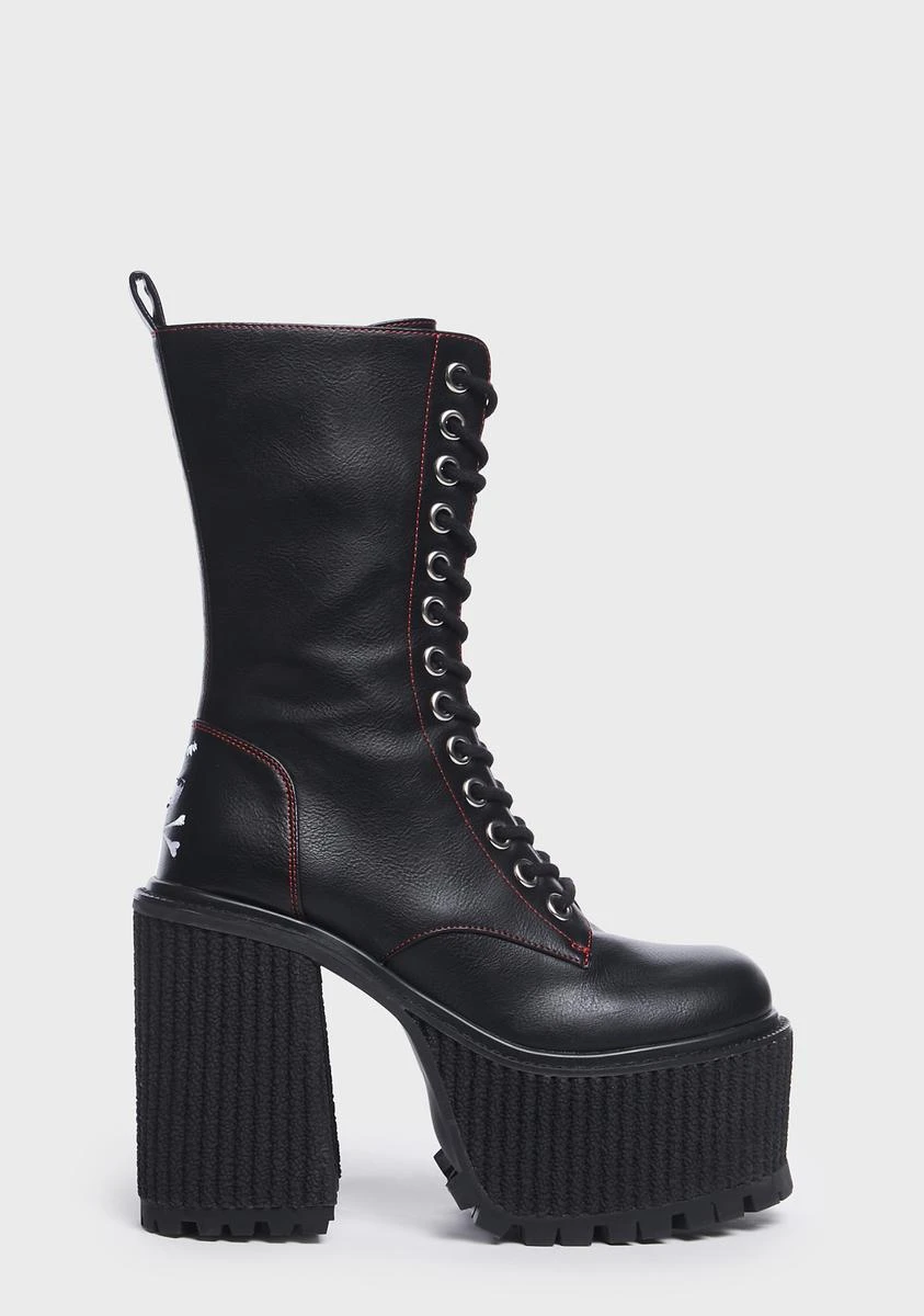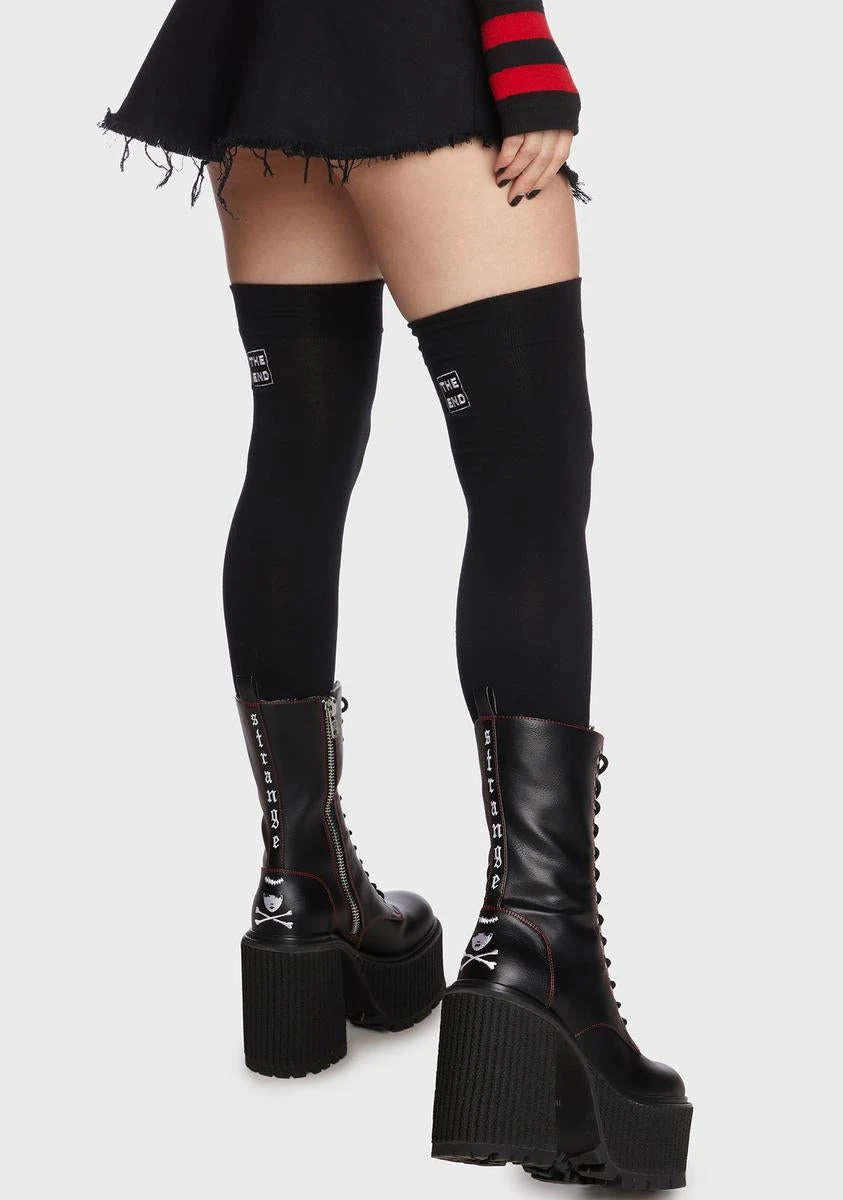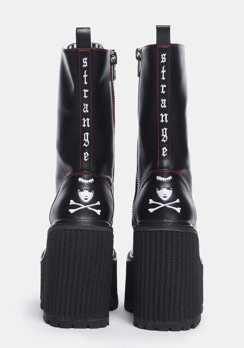 cuz don’t mess with me. These combat boots have a vegan leather construction, treaded platform soles, block heels, front lace ups, pull tabs, the word “Strange” and Emily The Strange crossbones graphic embroidered on the back, contrast colored stitching, and side zipper closures.