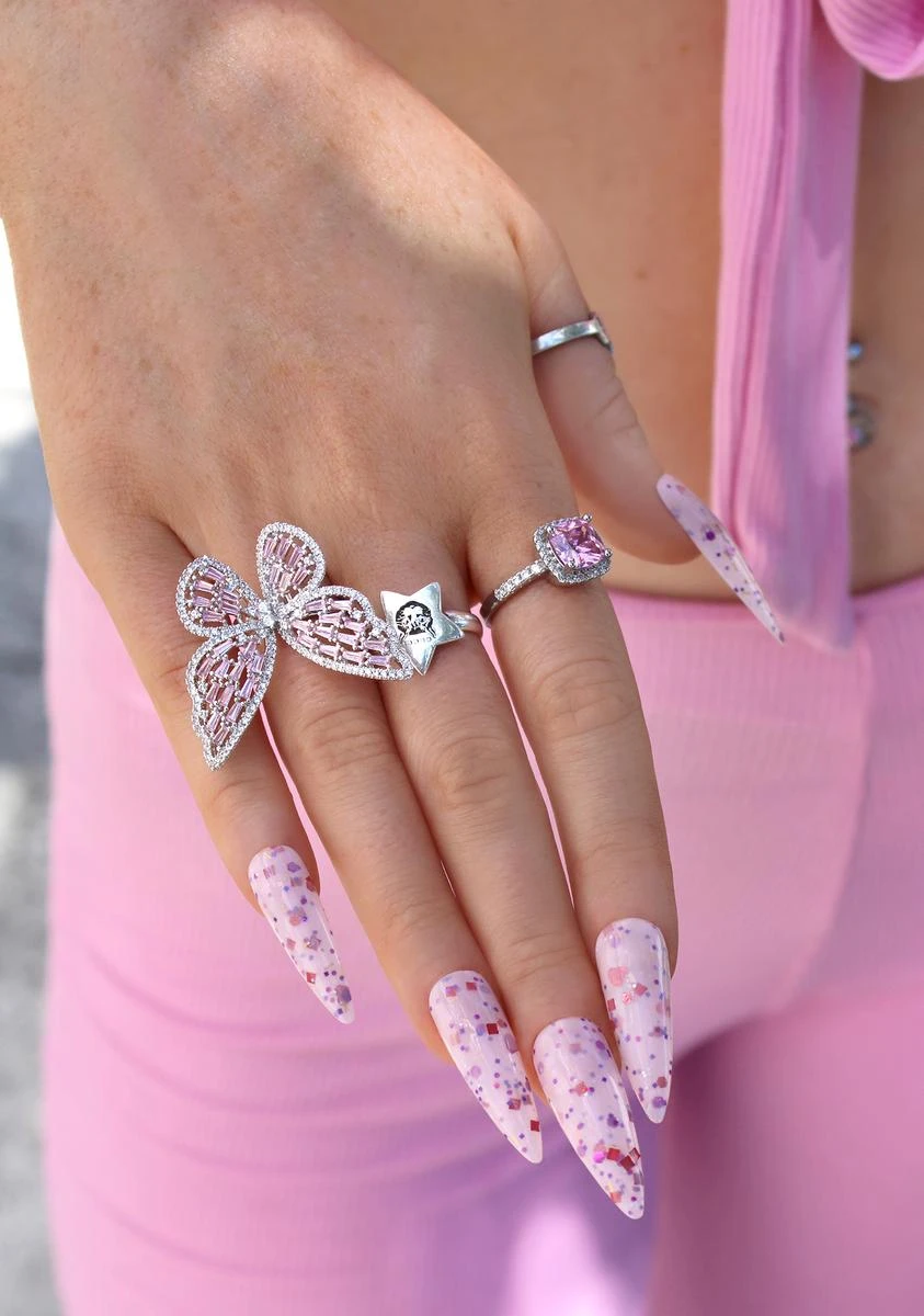 features a pastel pink milky base with multi-color glitters and has a streak free and chip resistant formula.
