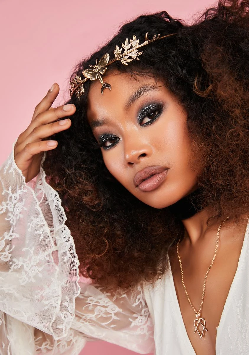 cuz you can’t resist. This headpiece comes in a metallic construction, with leaf details, a moth detail, and a crescent charm detail.