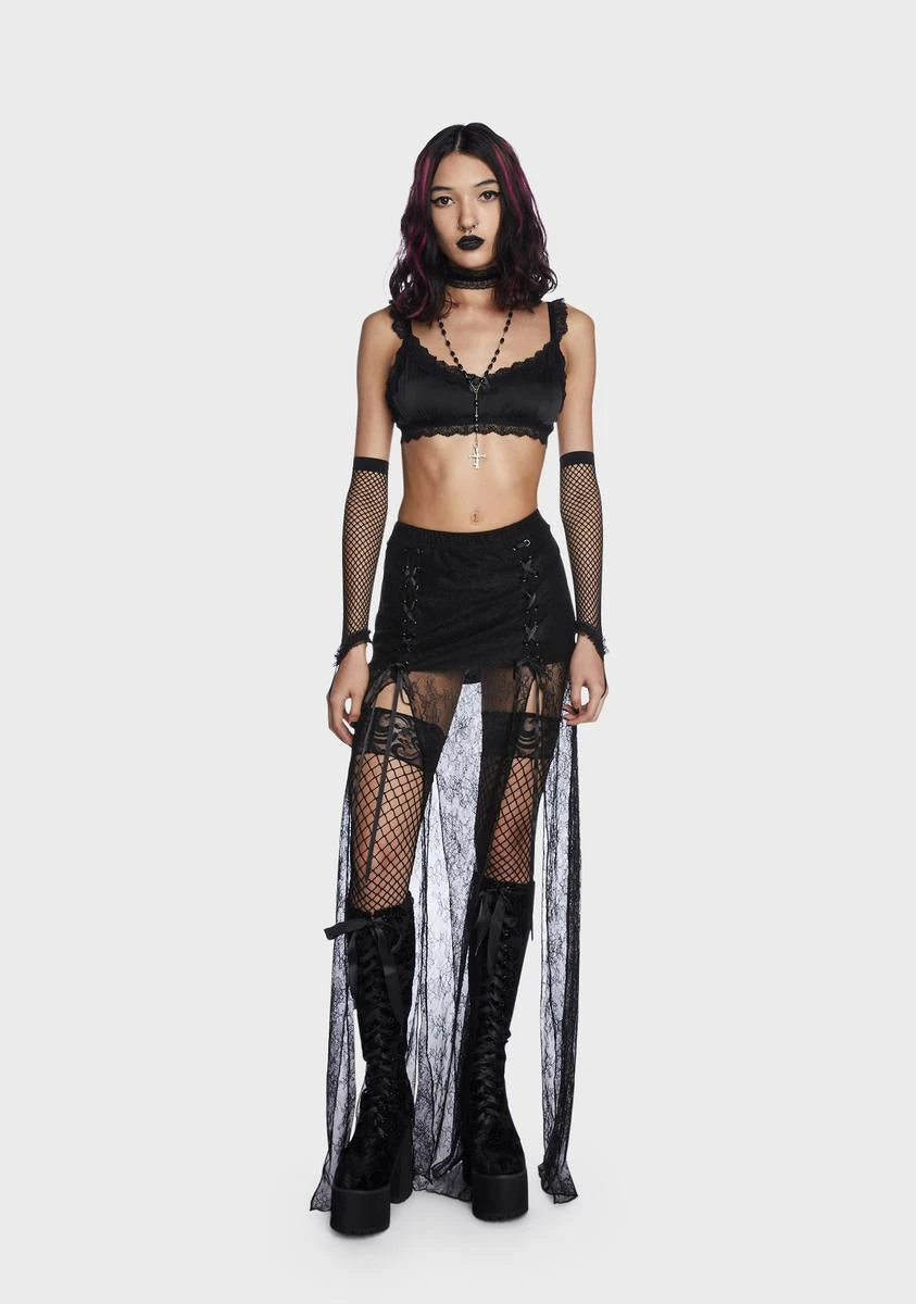 cuz your heart’s not here. This skirt comes with mini skirt lining, a lace overlay, elasticated waistband, lace up details, and slit details.