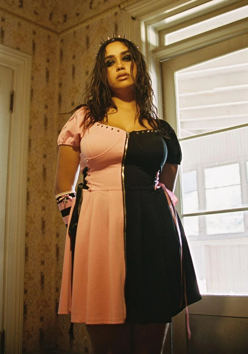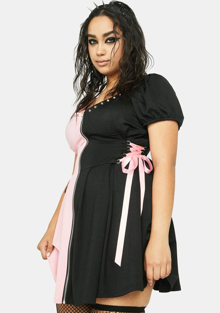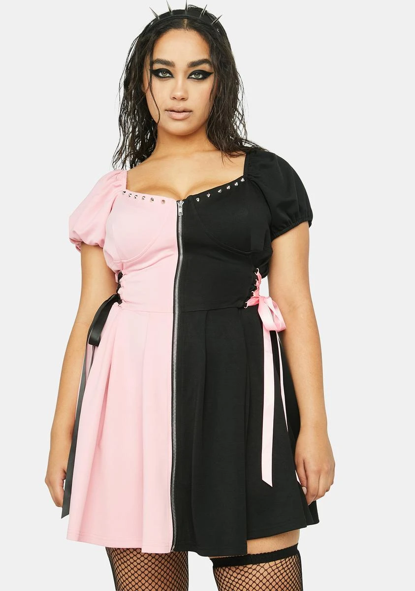 allow me to introduce myself. Turn heads in this fit n’ flare dress that has a split color design, spike studs along the neckline, puff sleeves, contrast satin ribbon lace up ties at the waist, and a zipper closure down the front.