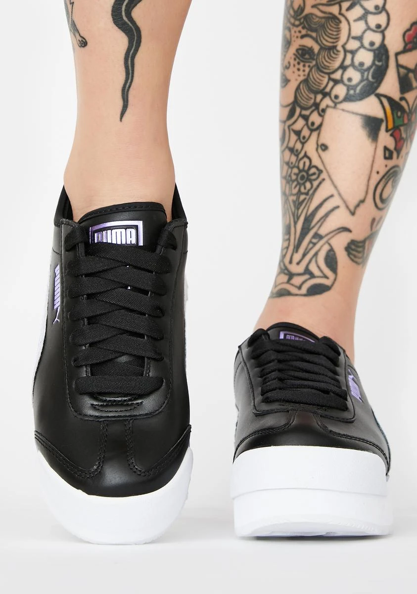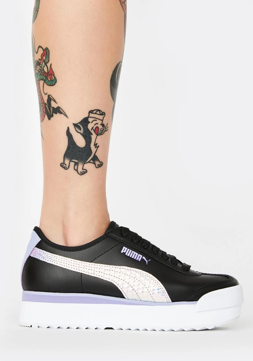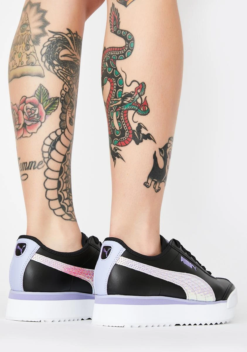 cuz yer the latest with the greatest, grl! Show it off in these supa sikk platform sneakers that have dope iridescent accents, full leather uppers, thicc treaded soles and adjustable lace-ups.