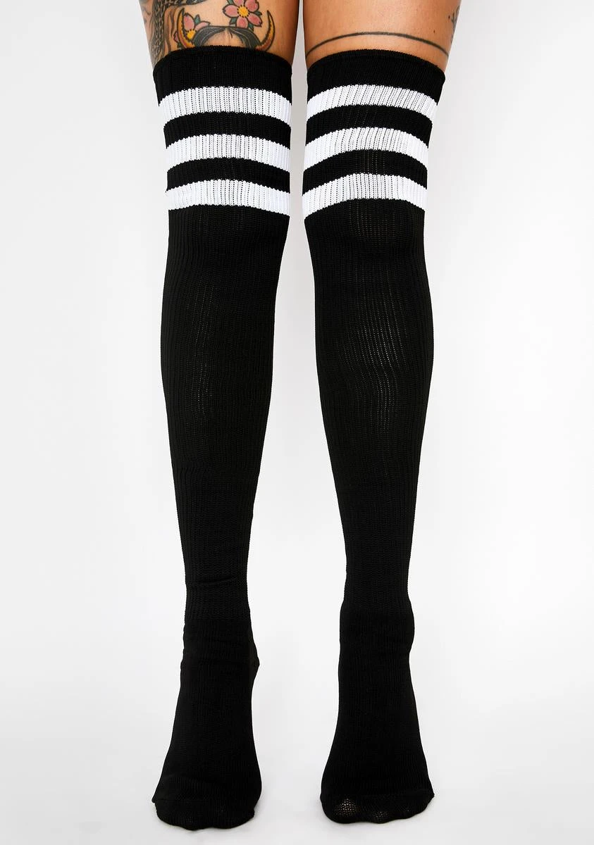 cuz all you do is win, bb! Shoot to score in these cute AF thigh high socks that have a stretchy ribbed knit N’ sporty striped design at the top.