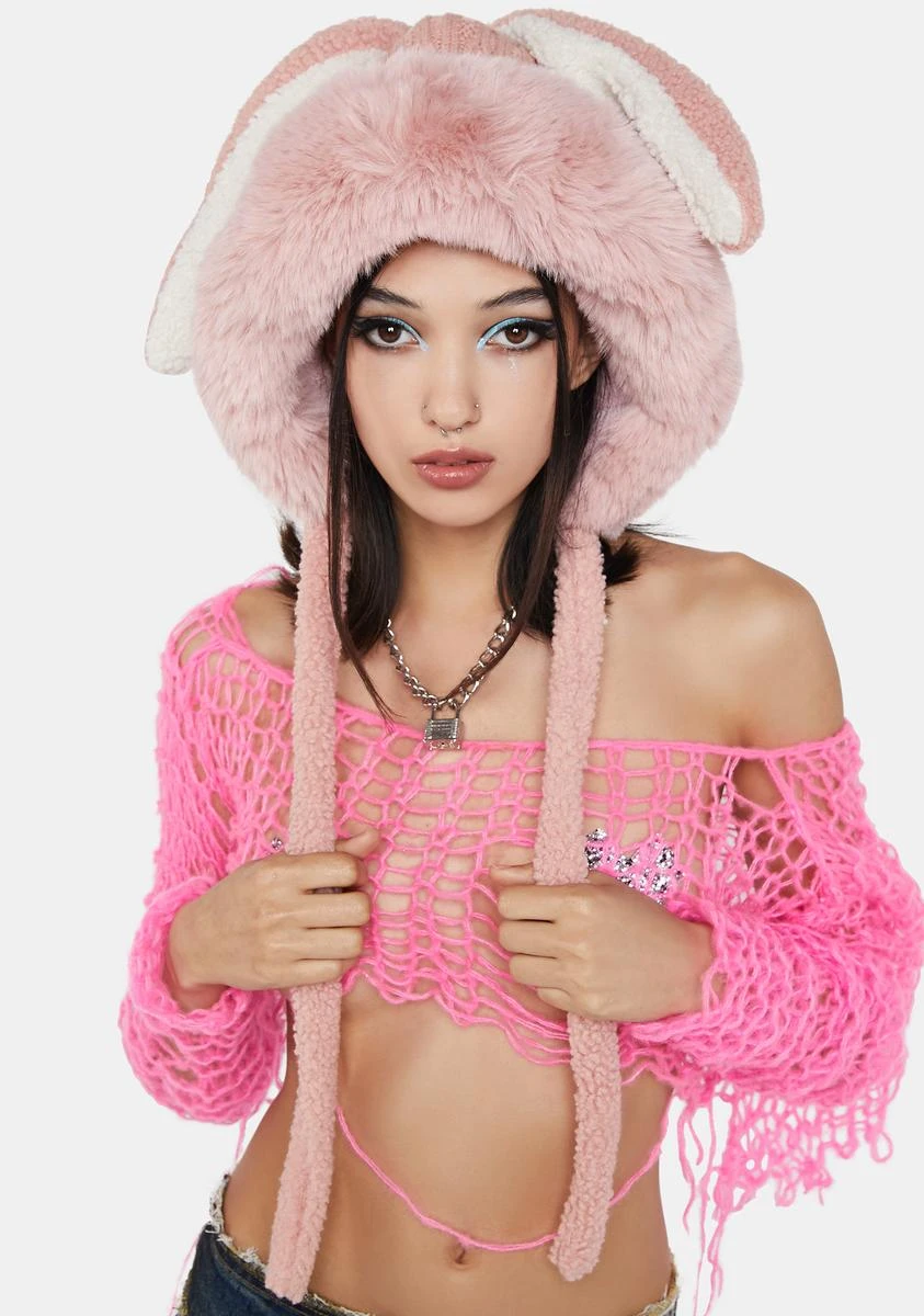 no bunny compares to you. This hat has a knit, faux sherpa, and faux fur construction, floppy bunny ears, and strings at sides.
