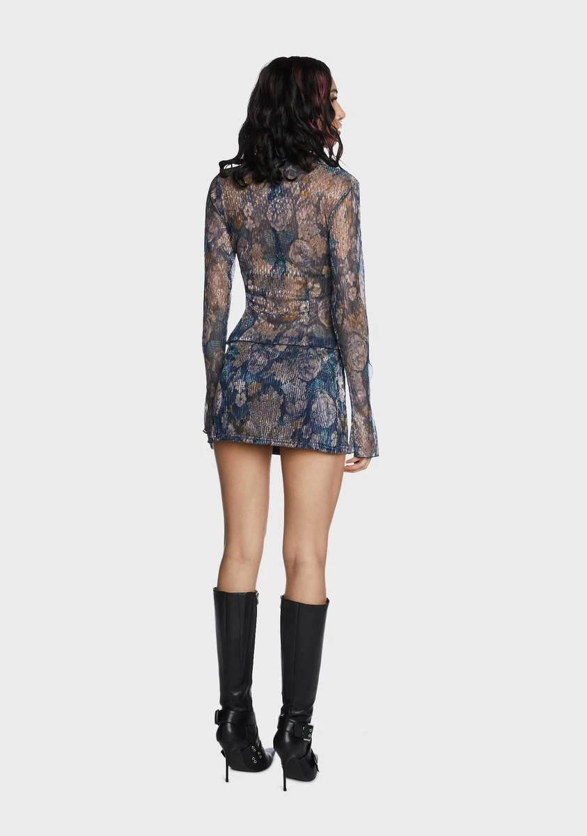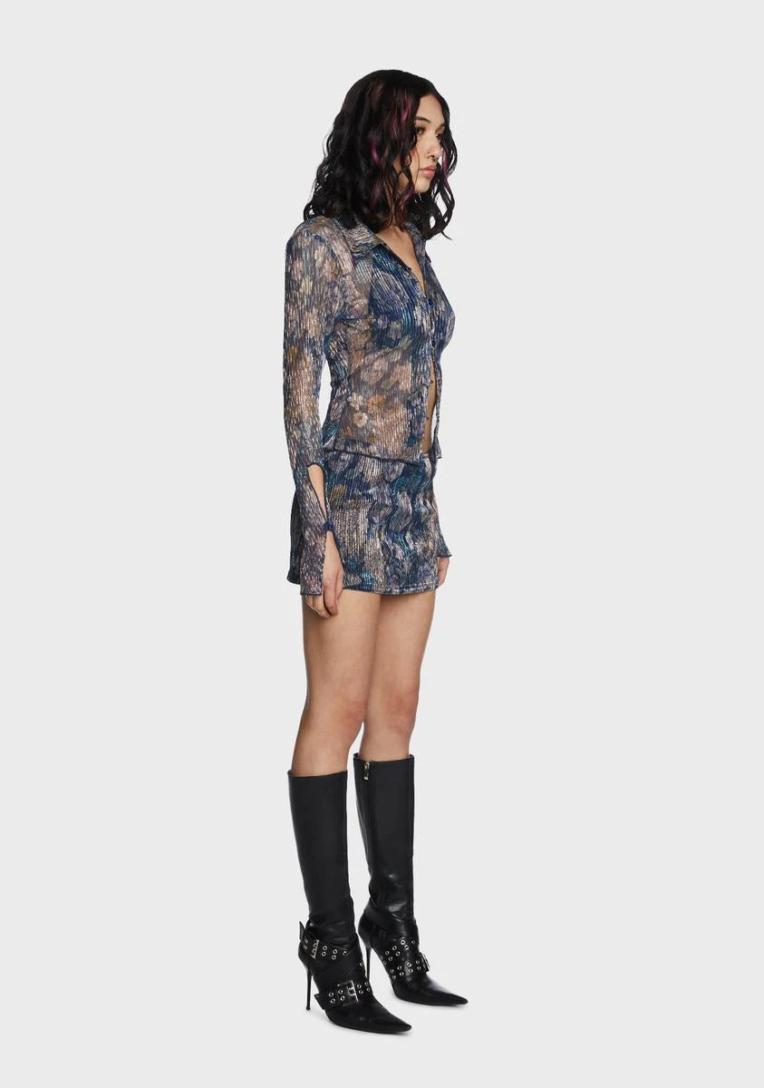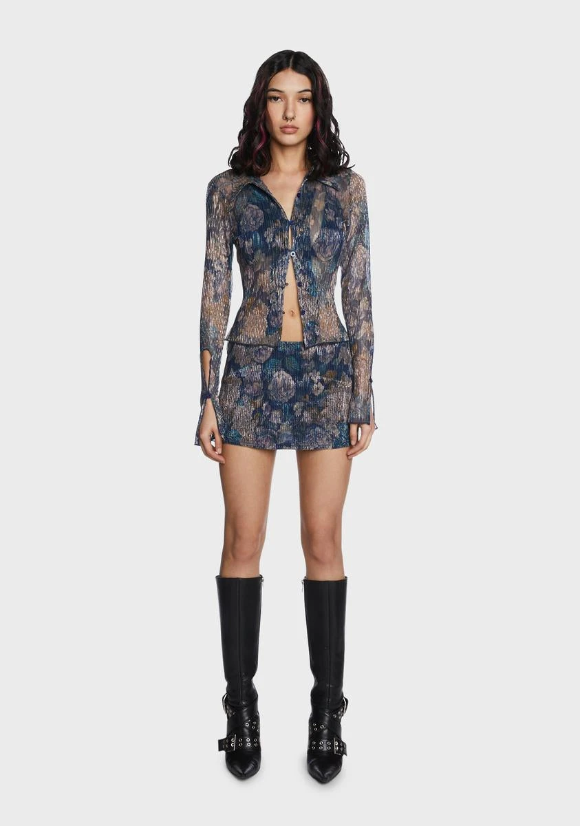 cuz be insta worthy! This skirt set includes a triangle bra top with halter neckline, a long sleeve top that has a shimmery ribbed construction, an all over marble print, a collared neckline, lettuce trim button cuffs, button front closures, and a matching mini skirt.