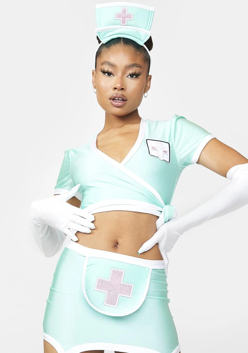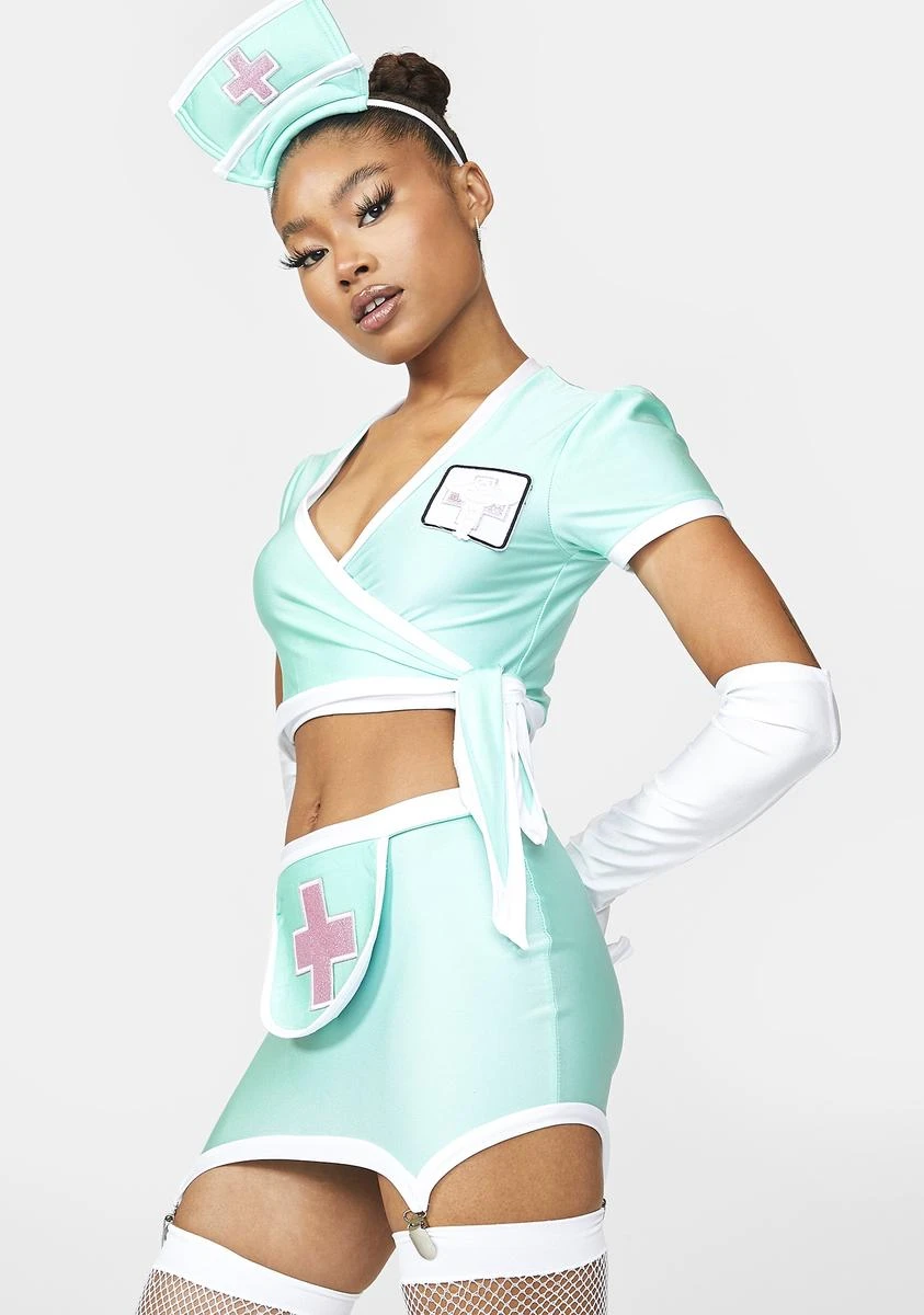 cuz youâre ready to see your patients. This sexy nurse costume has a wrap tie crop top, a mini skirt with garter clips, a matching headpiece, and gloves.