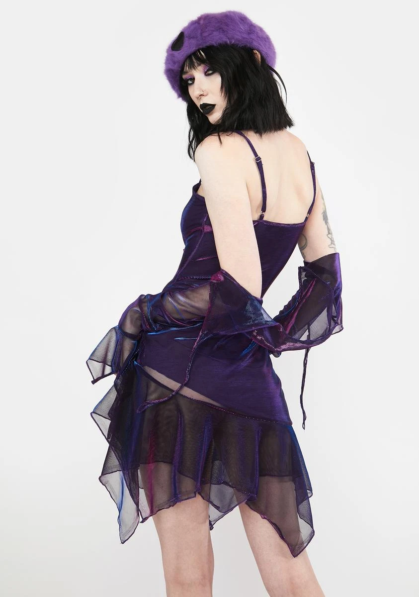 cuz on both the human and fairy worlds, you’re otherworldly. Cast your magic in this mini dress which has an iridescent construction, a sweetheart neckline, adjustable shoulder straps, an asymmetrical hem, a sheer mesh lining, and comes with a matching long sleeve shrug with flared cuffs.
