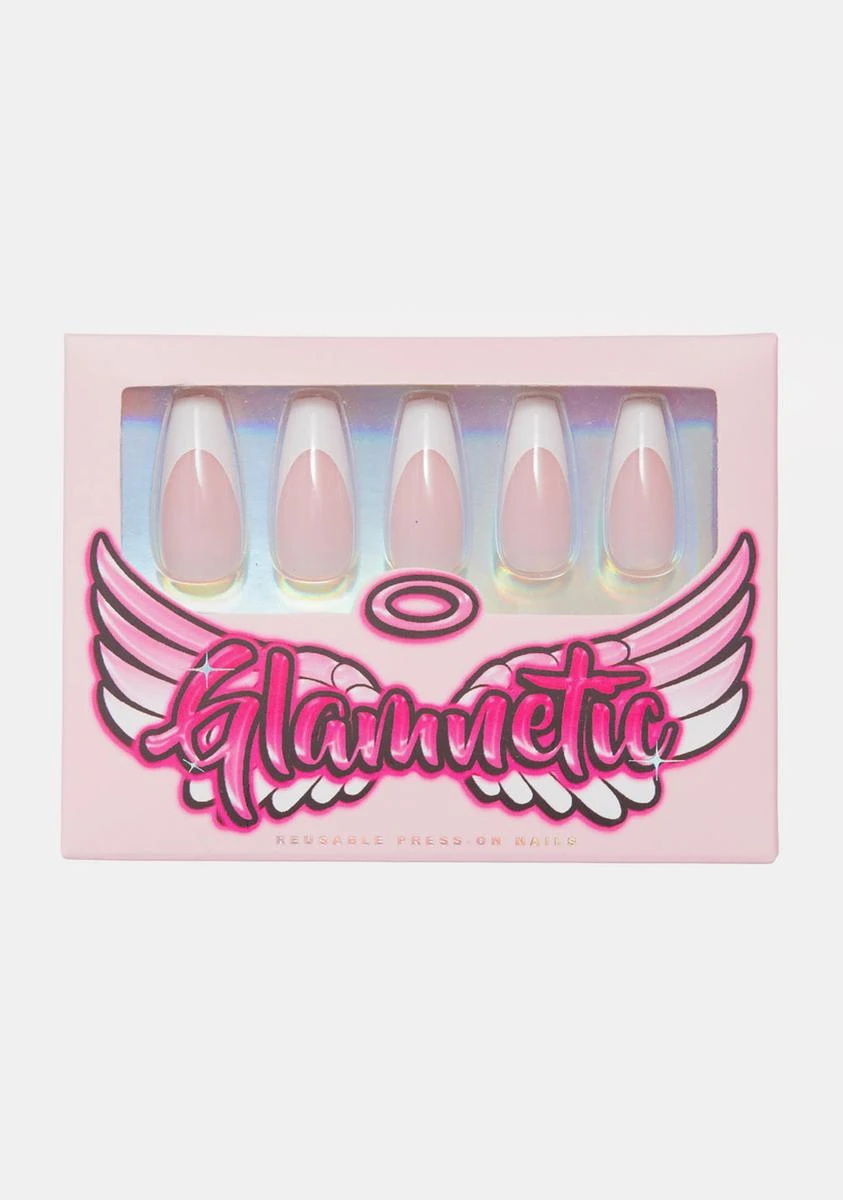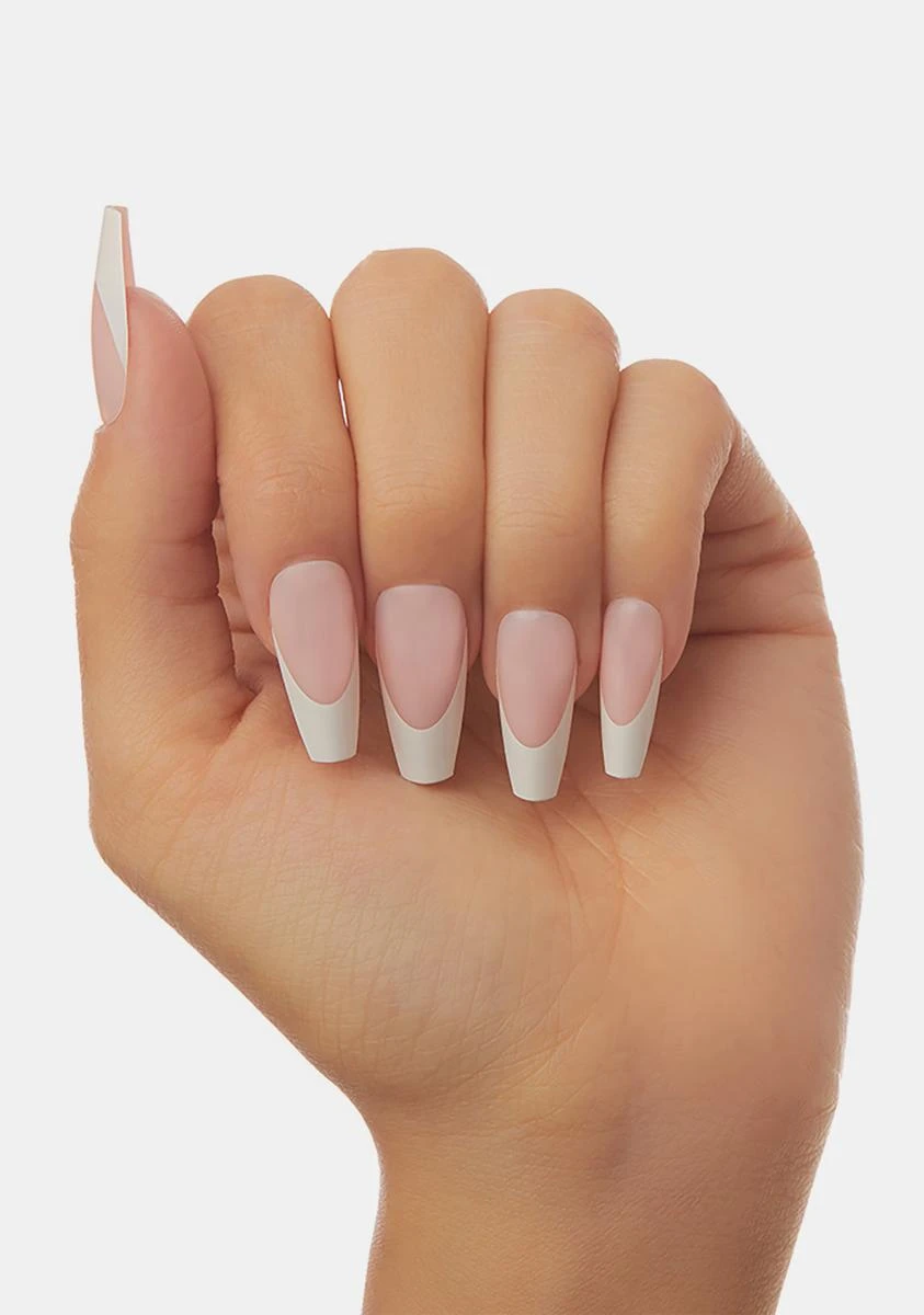 includes 30 press-on nails in 12 different sizes with a long coffin shape, french tip and glossy look, nail glue, a double sided nail file, cuticle stick, and alcohol pad.
