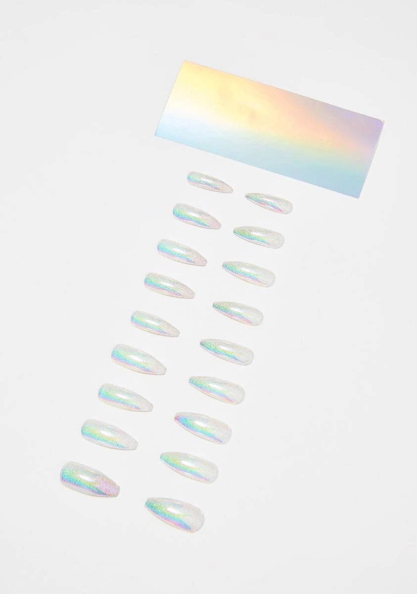 gotcha feelinâ yourself. Yassss hunty slay the game in these press-on acrylic nails that have a natural curve, sikk holographic glitter all ova Nâ a lux glossy iridescent top coat. Apply n’ trim em to any shape with the cuticle stick, nail file and nail glue that comes with ’em.
