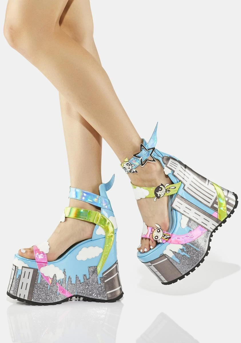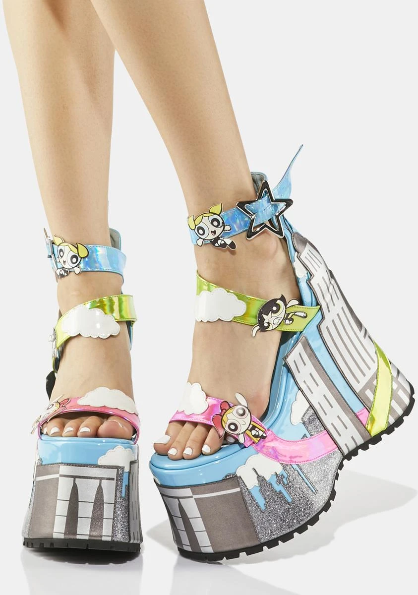 it’s a bird, it’s a plane – no, it’s the Powerpuff Girls! Defeat evil in these sandals that have mega platform soles with an animated cityscape design, metallic upper straps with Powerpuff Girl and cloud appliques, and adjustable ankle straps with star-shaped buckles.