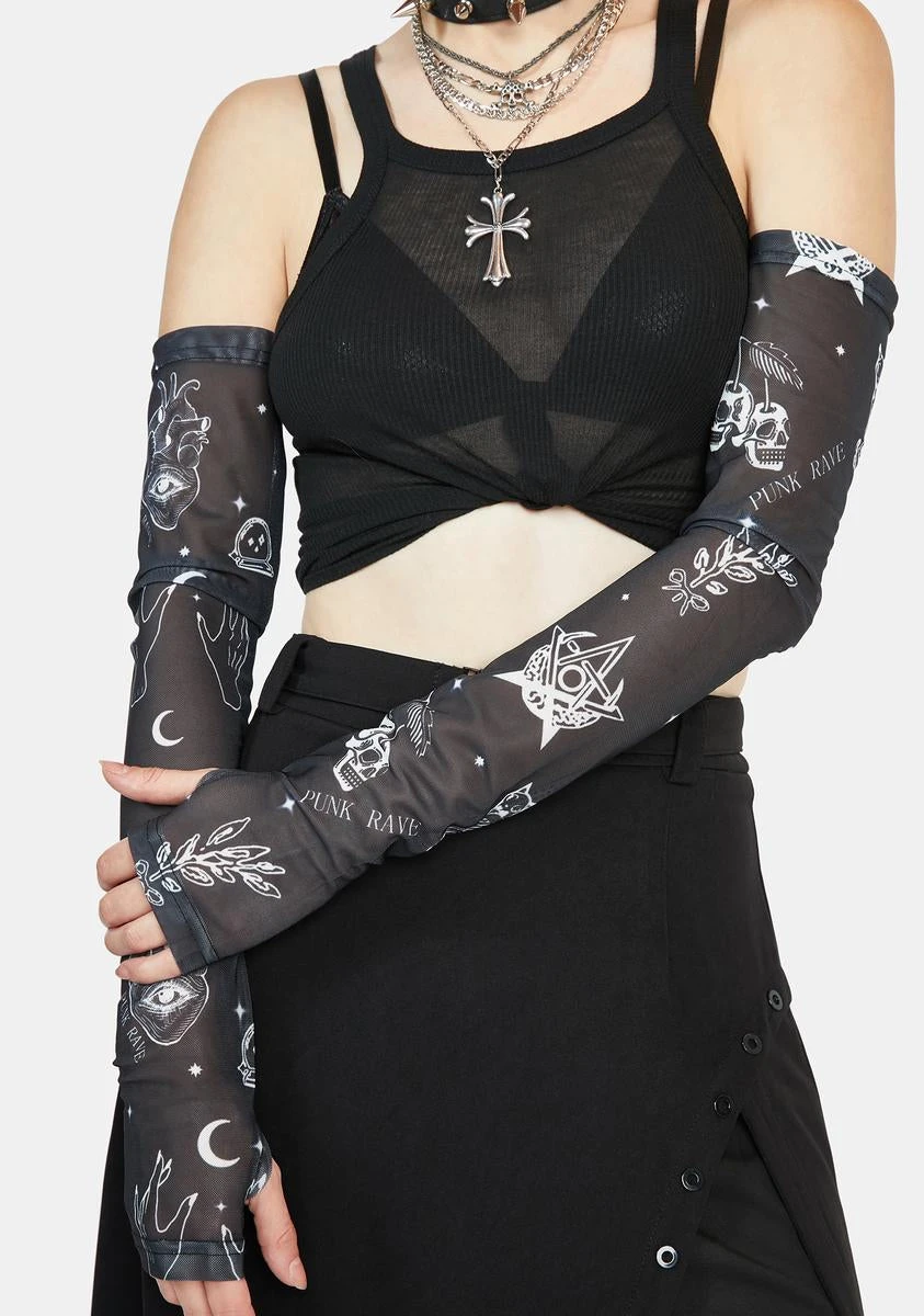 you bring sin to this cyberspace. Spin a world wide web in these fingerless gloves with a sheer construction & witchy icons printed all over.