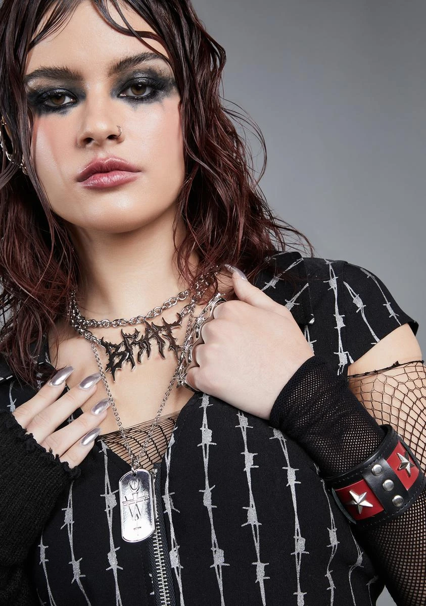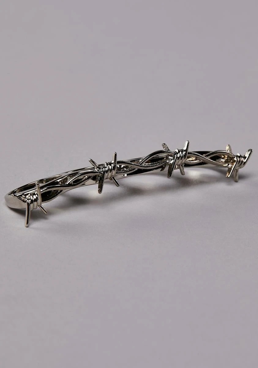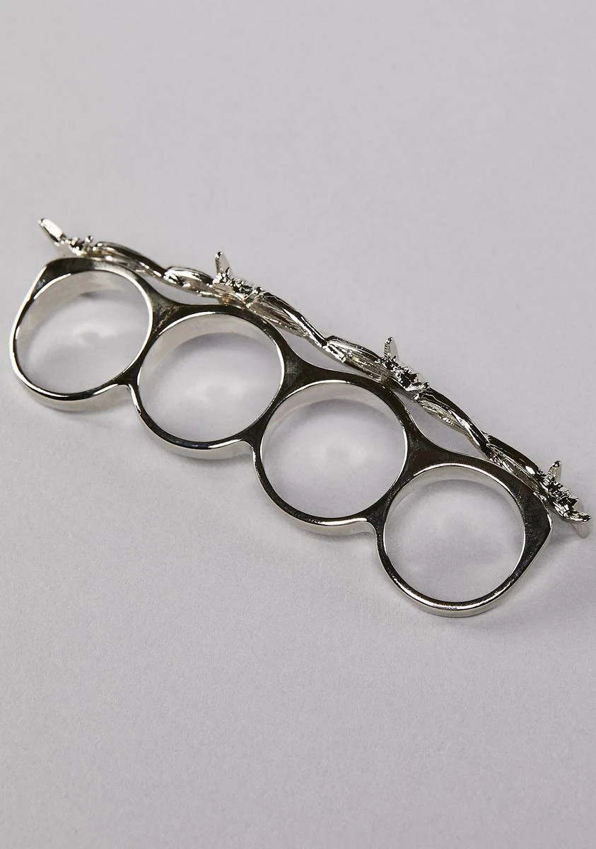 cuz there’s nothing left to do. This four finger ring has a metal construction and a barbed wire design.