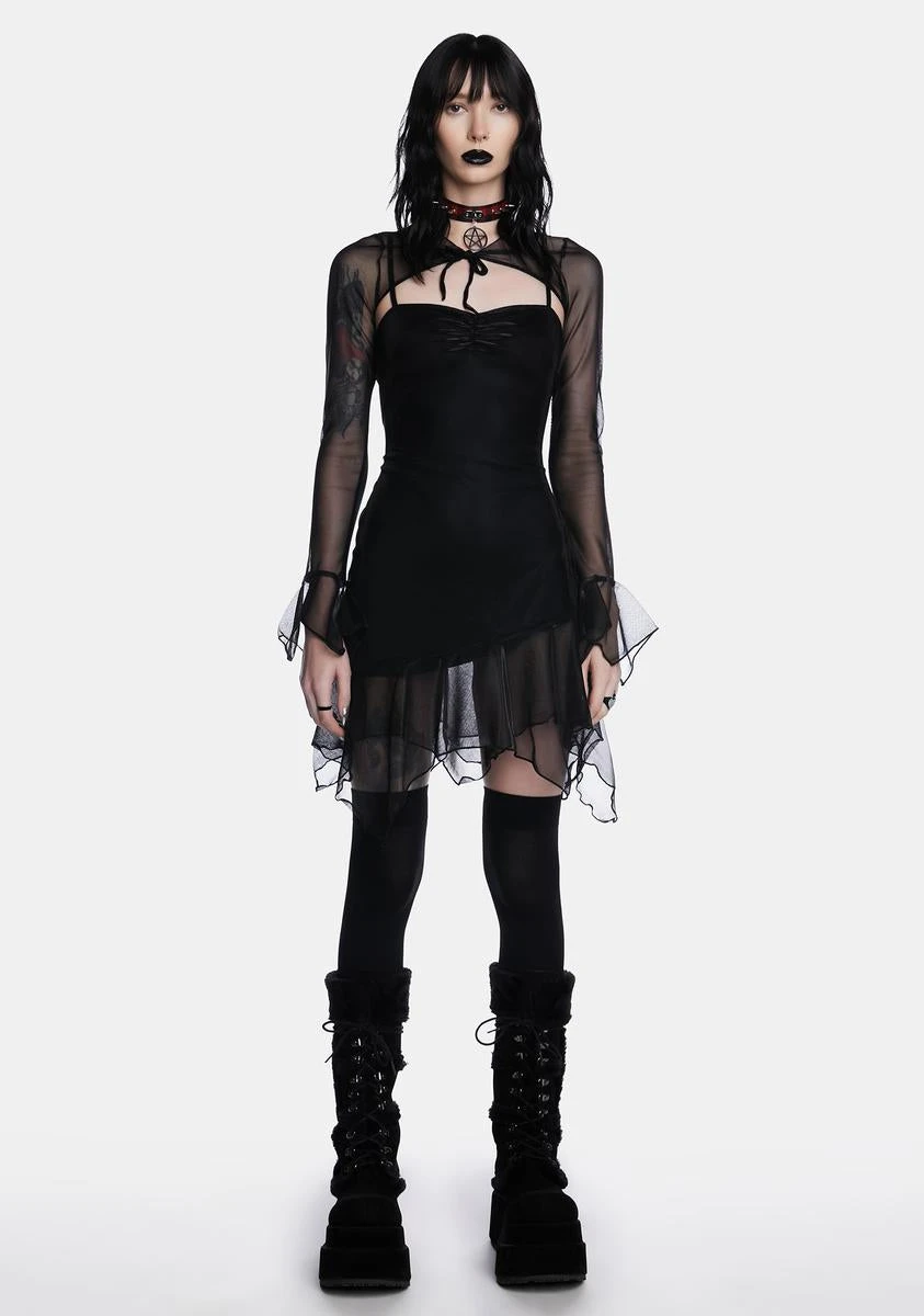 cuz on both the human and fairy worlds, you’re otherworldly. Cast your magic in this mini dress which has an iridescent construction, a sweetheart neckline, adjustable shoulder straps, an asymmetrical hem, a sheer mesh lining, and comes with a matching long sleeve shrug with flared cuffs.